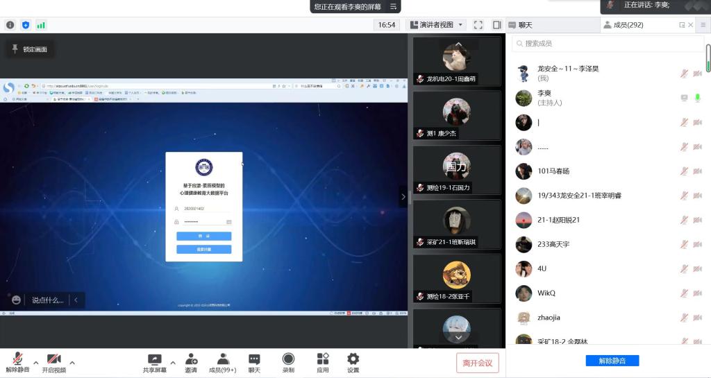 为推进“四级”网络工作格局,加大对班级心理委员、寝室联络员等员工骨干的心理危机干预能力培训力度,提高其对心理危机预防与干预意义的认识,进一步优化自身心理素质和帮助他人的能力,发挥好朋辈辅导作用。辅导员李爽以腾讯会议的形式在保证防疫安全要求的前提下为全体心理委员、寝室联络员针对心应激-素质模型的心理健康教育大数据平台开展了具体操作的培训,并着重强调了心理委员和寝室联络员的岗位职责,更需强化心理危机意识,真正帮助到有需要的同学。