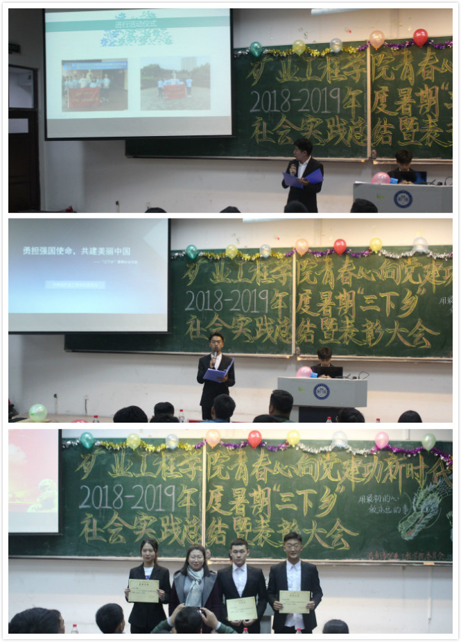 活动在《光荣啊,中国共青团》的歌声中拉开帷幕,贾春雷同学宣读社会实践表彰决议。表彰采矿18-3班、采矿18-4班、矿加18-2班荣获社会实践一等奖;表彰采矿18-1班、采矿18-2班、地质18-1班、地质18-2班、测绘18-3班荣获社会实践二等奖;表彰矿加18-1班、勘查18-1班、勘查18-2班、测绘18-1班、测绘18-2班、城乡18-2班获得社会实践三等奖,采矿16-3班省级重点团队代表为大家做社会实践活动分享,最后杨永超老师对社会实践的意义、效果和成绩做了总结。