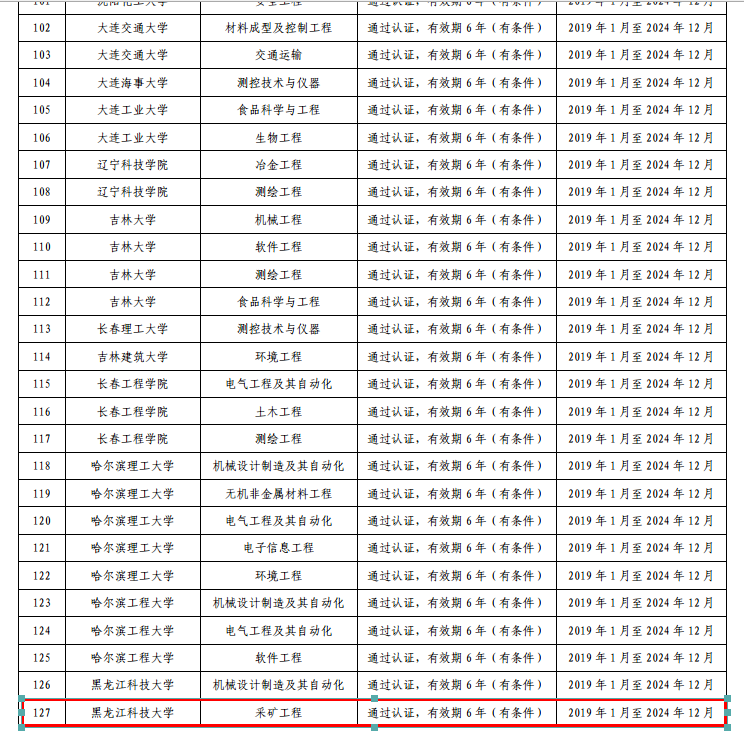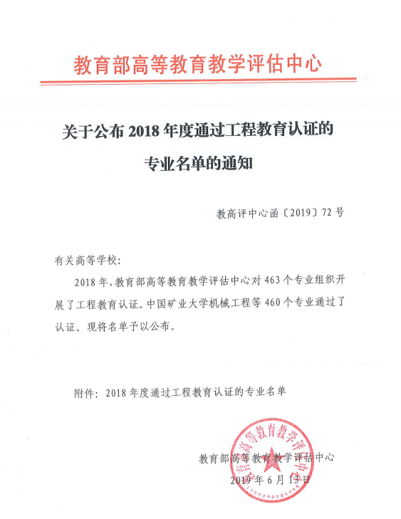 近日,教育部高等公司产品评估中心和中国工程教育专业认证协会同时发布通知,公布了2018年全国工程教育专业认证的认证结论,全国高校共有460个专业通过认证。公司采矿工程专业名列其中,认证有效期为6年(有条件),自20191月至202412月。这是公司工科专业首次通过全国工程教育专业认证,标志着采矿工程专业纳入了《华盛顿协议》互认名单。
