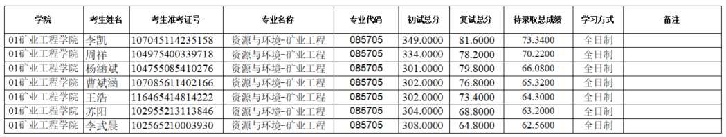 xc体育2025年硕士研究生招生考试(资源与环境-矿业工程)第二次调剂待录取名单