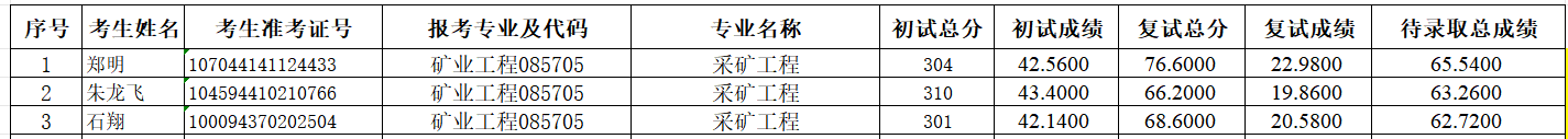 xc体育2024年硕士研究生招生考试矿业工程(085705)第六次调剂复试待录取考生名单