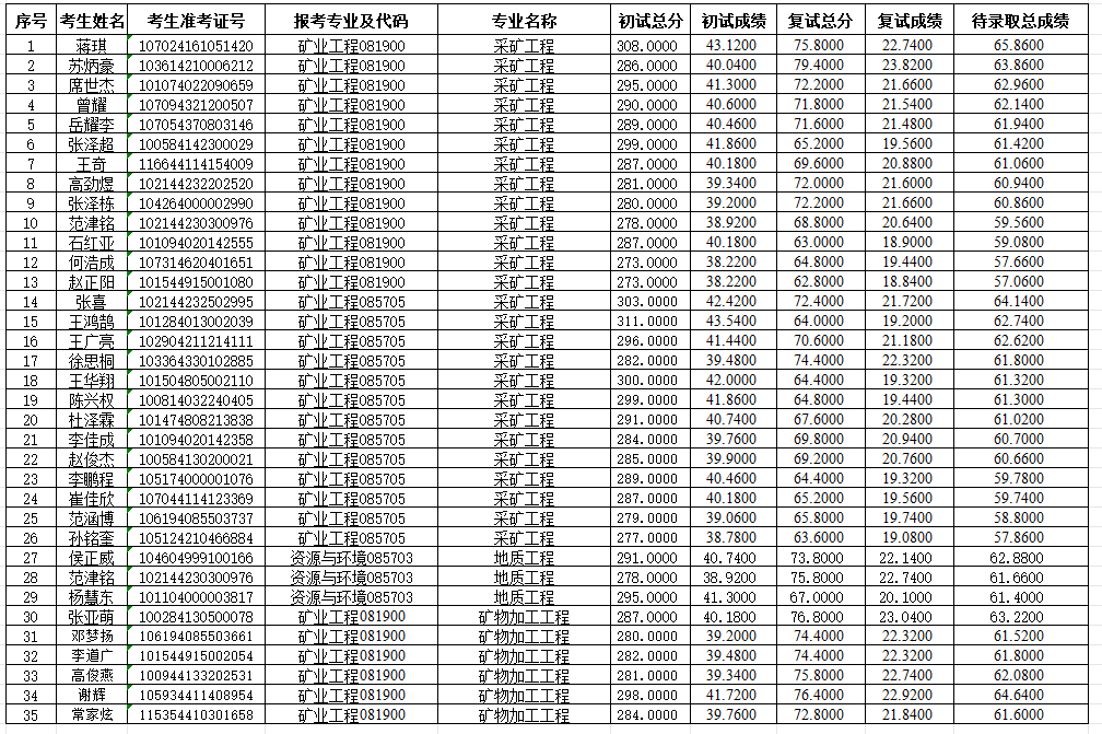 xc体育2024年硕士研究生考试第一次调剂地质工程、矿物加工工程、采矿工程专业录取名单