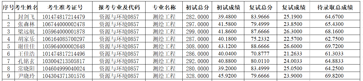 xc体育2024年硕士研究生招生考试测绘工程专业第一次调剂复试待录取考生名单